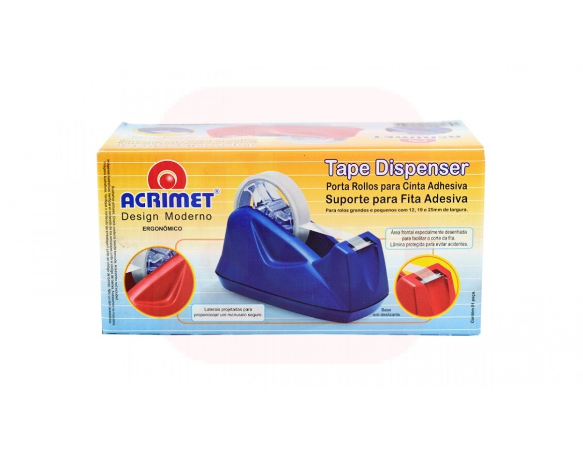 Suporte para fitas adesivas em poliestireno, para fitas de 12, 19 e 25 mm de largura. Sua base é antiderrapante e seu cortante de fita é de aço inox, além de ser recuado, garantindo mais segurança e conforto no uso. Ideal para uso doméstico e corporativo.