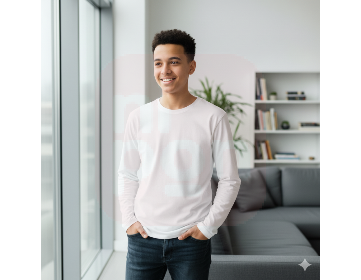 Este é um item essencial e versátil: uma camiseta branca de manga longa. Ela apresenta um design clássico e atemporal, com gola redonda e mangas compridas que oferecem cobertura extra, sendo ideal para diversas ocasiões e climas. A cor branca pura a torna fácil de combinar com qualquer peça de roupa, enquanto o tecido parece confortável e respirável, perfeito para o dia a dia.